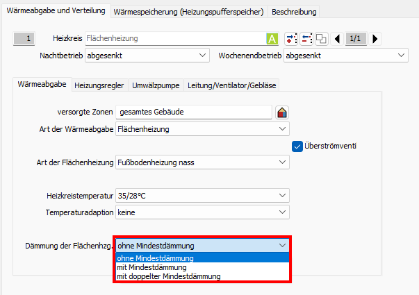 - Dämmung der Flächenheizung.: Auswahl zwischen den folgenden Angaben: