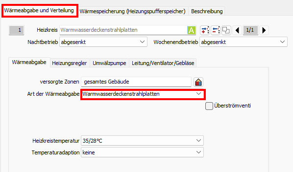 Wählen Sie unter Art der Wärmeabgabe: Warmwasserdeckenstrahlplatten