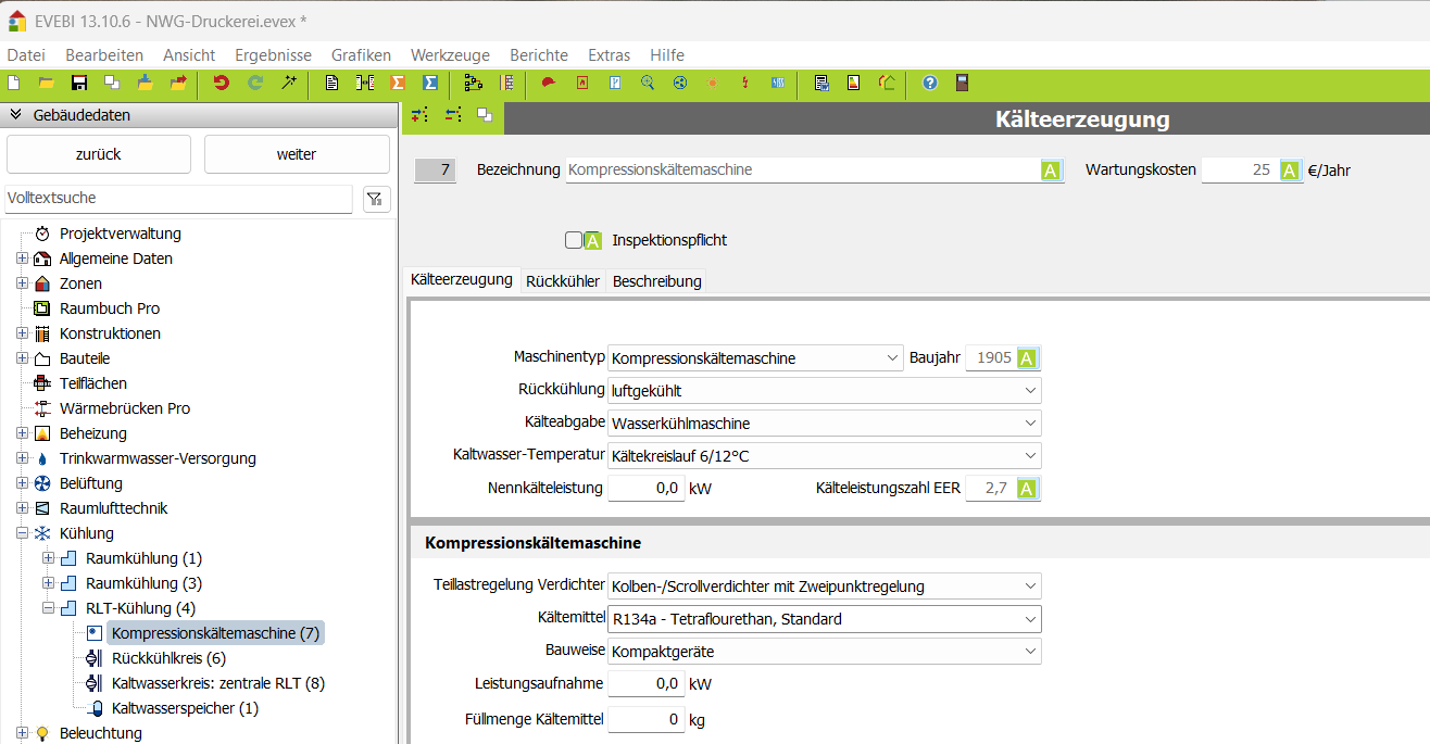Sie können zwischen einer Kompressionskältemaschine, Absorptionskältemaschine und einer gasbefeuerten Absorptionskältemaschine, Kühlung mit Grundwasser, Kühlung über Erdsondenfeld wählen. Erläuterungen zu den Kältemaschinen finden Sie in unseren Schulungen zur DIN V 18599 »