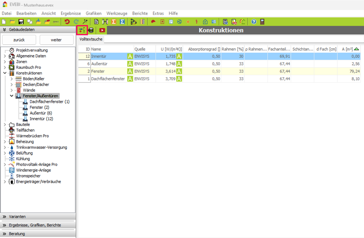 - Wählen Sie im Navigationsbereich den Eintrag FENSTER/AUßENTÜREN unter dem Knotenpunkt KONSTRUKTIONEN.