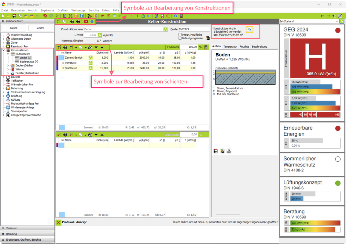 Sie können sich den Aufbau der Konstruktion, den Temperaturverlauf im Bauteil und die Dampfdiffusion des Bauteils ausgeben lassen.