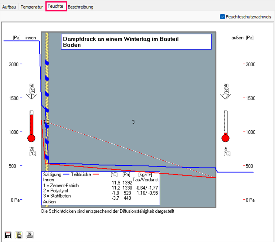 Die angezeigten Schichtdicken entsprechen nicht den Bauteilstärken, sondern den Diffusionswiderständen.