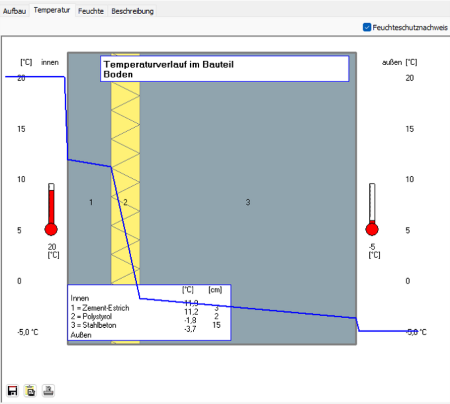 Sie können sich den Aufbau der Konstruktion, den Temperaturverlauf im Bauteil und die Dampfdiffusion des Bauteils ausgeben lassen.