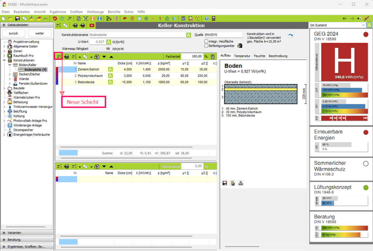 - Neues Material: Es kann direkt das Material aus der Baustoffdatenbank für die neue Schicht gewählt werden.