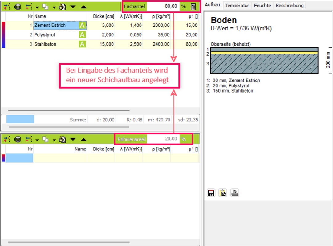 - Tragen Sie den Fachanteil zum Schichtaufbau direkt ein. Es wird eine weitere Tabelle für die Eingabe eines weiteren Schichtaufbaus angelegt.