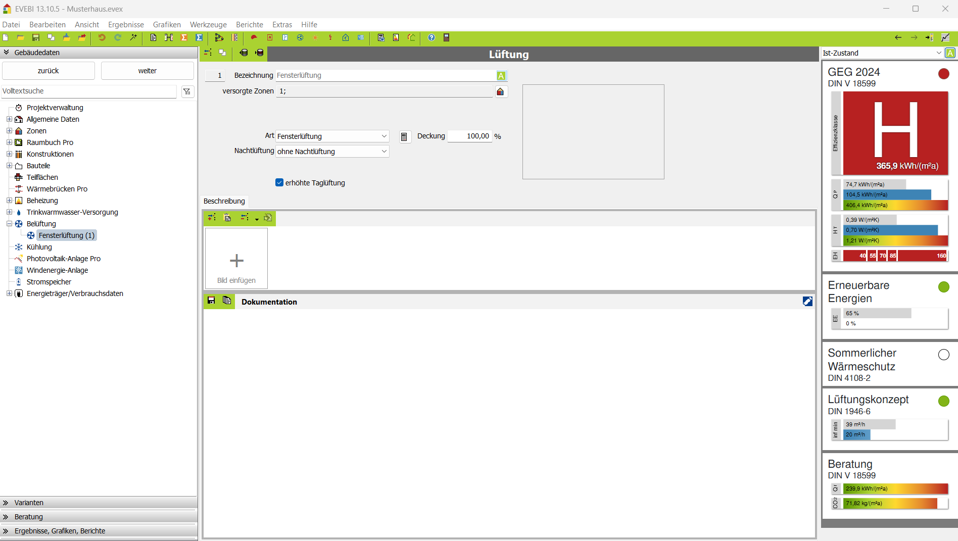- Öffnen Sie im Navigationsbereich den Eintrag BELÜFTUNG und wählen Sie den Eintrag LÜFTUNG. Die Maske zur Belüftung wird geöffnet: