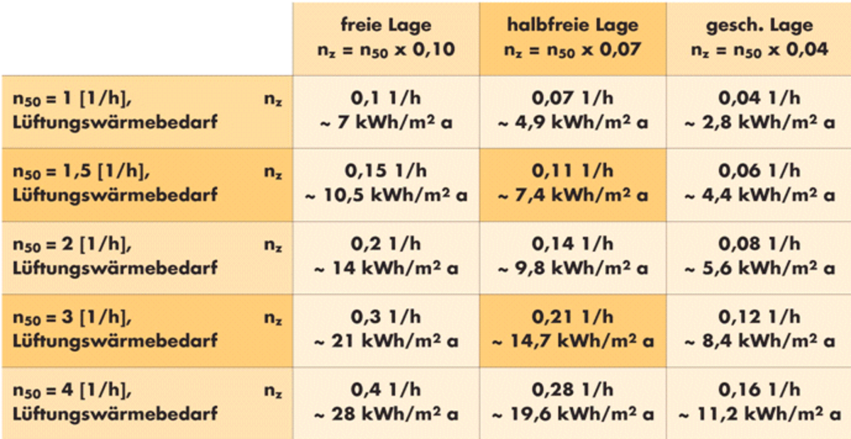 Die folgende Tabelle zeigt Ihnen die Umrechnungen von einem ermittelten n50-Wert (Blower-Door-Messung) zum einzugebenden Luftwechsel: siehe Bild