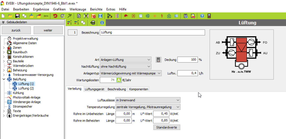 Die Belüftung können Sie in mehrere Lüftungsbereiche untergliedern. Für jeden Lüftungsbereich können Sie eine freie oder eine Lüftungsanlage angeben.