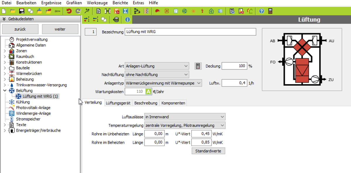 Luftauslässe: Diese können innen oder außen liegen. Temperaturregelung: Geben Sie an, ob eine Einzelraumregelung vorliegt oder die Lüftung zentral geregelt wird. Länge der Rohre: Geben Sie die Länge der Lüftungsrohre im Beheizten und im Unbeheizten an. Über die Schaltfläche STANDARDWERTE können Sie die Längen auch vom Programm eintragen lassen. Diese werden dann anhand der Regelung und Aufstellung berechnet.