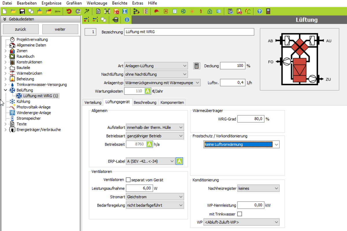 Die Maske Lüftung wird angezeigt: siehe Bild 3. Wählen Sie als Lüftungsart LÜFTUNG ÜBER ANLAGE. 4. Wählen Sie als Anlagentyp WÄRMERÜCKGEWINNUNG MIT WÄRMEPUMPE. Die erforderlichen Daten werden angezeigt (s. o.).