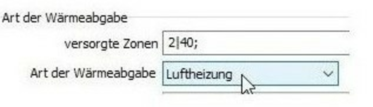3. Ein weiterer Heizkreis ist zu definieren, so dass ein Umluftbetrieb bzw. das Heizen über die Lüftungsanlage (wenn vorhanden) beschrieben wird. Leider lässt sich das nur annähernd, aber ausreichend zielgenau mit der Art der Wärmeabgabe über "Luftheizung" darstellen (die Auswahl zu Gebläsemotor und Luftauslass gehen nicht relevant in die Berechnung ein).