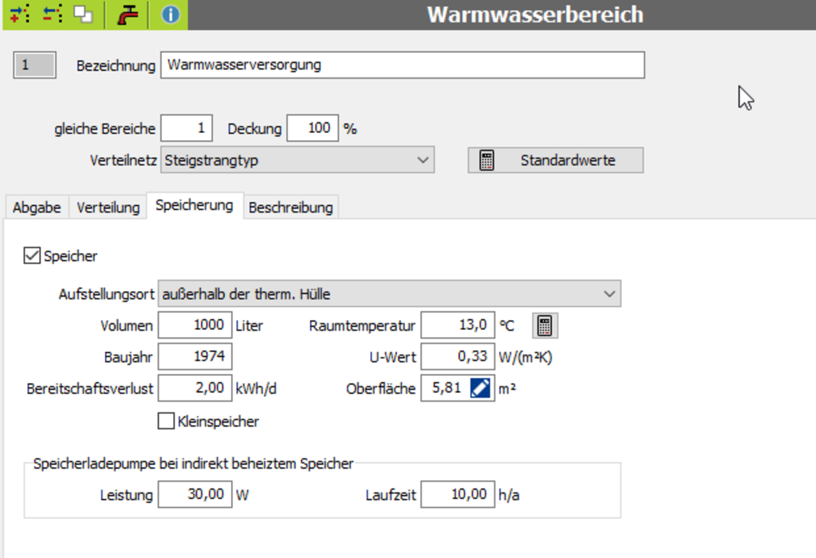 Befindet sich in dem Objekt ein Warmwasserspeicher, so können Sie die Daten zum Speicher eingeben.
