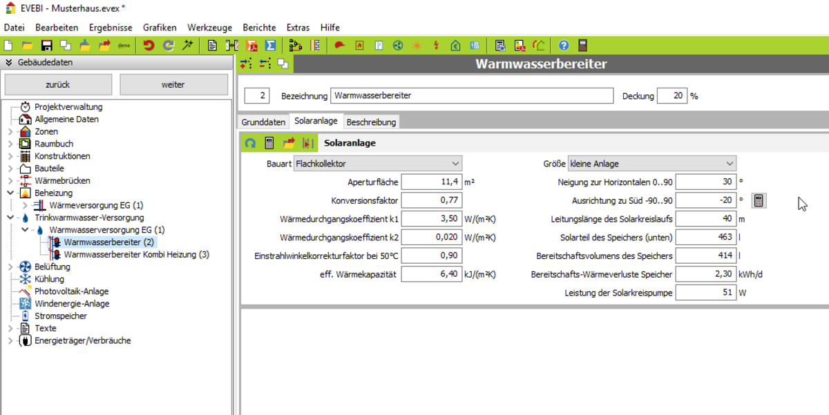 Die Daten zur Solaranlage können Sie dem Produktblatt entnehmen. Daten, die Sie nicht angeben, werden durch Standardwerte nach DIN V 4701-10 belegt. Nachfolgend sollen ergänzend einige Daten erläutert werden.