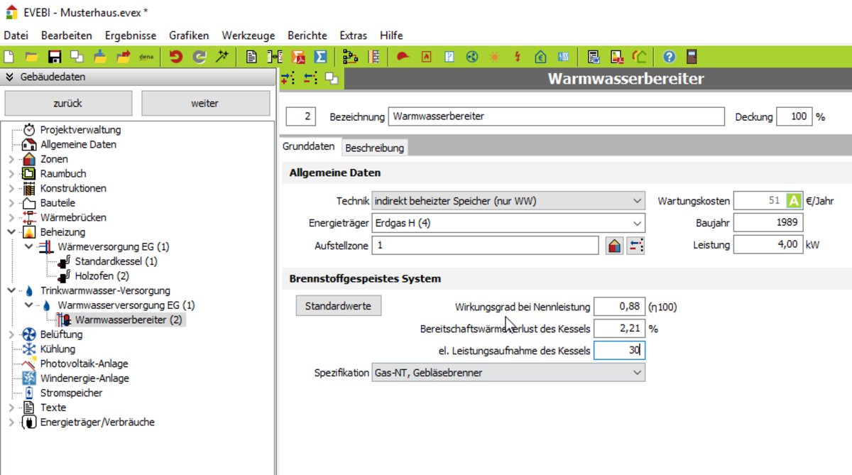Maske detaillierte Berechnung Energieträger gespeist/ indirekt beheizt