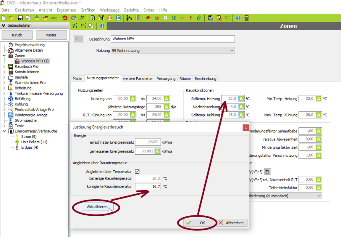 Sobald die Schaltfläche ÜBERNEHMEN gedrückt wird, wird die korrigierte Raumtemperatur in die Nutzungsparameter der Zone übernommen. D.h. diese Temperatur geht auch in die Wirtschaftlichkeitsbetrachtung mit ein, da bei dieser die individuelle Randbedingungen anzusetzen sind. Es werden die tatsächlichen Kosten des Energieträgers im Ist-Zustand angesetzt.