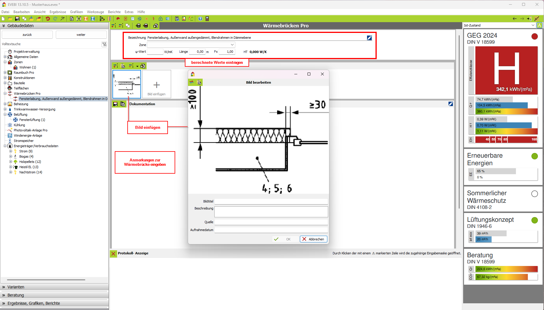 - Zu jeder Wärmebrücke kann eine Beschreibung eingegeben sowie ein Bild importiert werden.