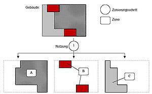 • Eine Zone fasst den Grundflächenanteil bzw. Bereich eines Gebäudes zusammen, der durch gleiche Nutzungsrandbedingungen gekennzeichnet ist und keine relevanten Unterschiede hinsichtlich der Arten der Konditionierung und anderer Zonenkriterien aufweist.