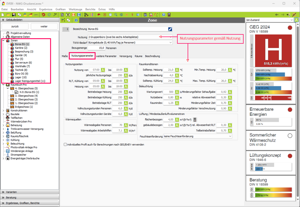 Für die Energieberatung können die Nutzungsparameter individuell angepasst werden.