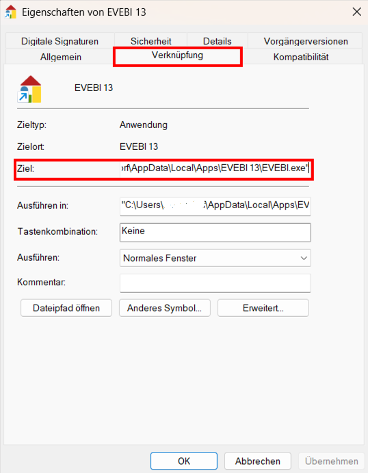 - Benennen Sie die neue (kopierte) Verknüpfung sinnvoll um, z. B. „Evebi Ref“. Dazu öffnen Sie unter Eigenschaften den Reiter "Allgemein".