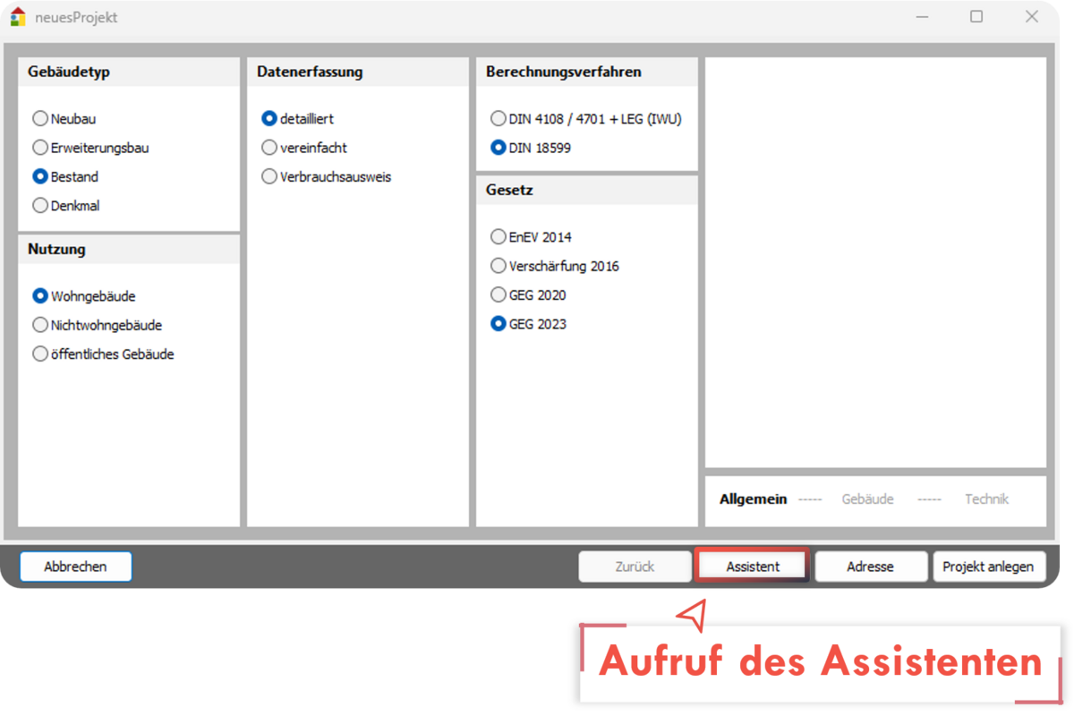 Berechnungsverfahren: Wählen Sie das Berechnungsverfahren, in dem Ihr Projekt bilanziert werden soll. Für Wohngebäude kann zwischen DIN 4108/ DIN 4701 und DIN V 18599 gewählt werden. Für die Energieberatung werden die individuelleren Randbedingungen (Nutzung, Klimaregion, etc.) mit dem Berechnungsverfahren nach LEG („Leitfaden energiebewusste Gebäudeplanung“, Institut für Wohnen und Umwelt) herangezogen. Für Nichtwohngebäude erfolgt die Berechnung hauptsächlich nach DIN V 18599.