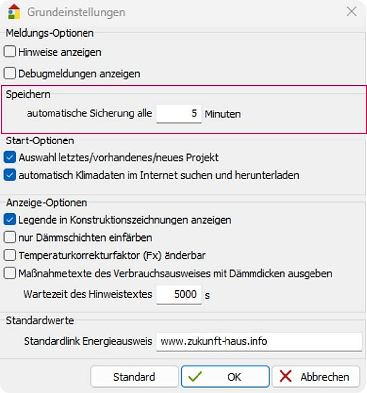 Das Intervall zum automatischen Sichern des Projektes (Standard: 5 Minuten) können Sie anpassen. Wählen Sie dazu über das Menü EXTRAS--> EINSTELLUNGEN den Dialog GRUNDEINSTELLUNGEN. Geben Sie Ihr gewünschtes Speicherintervall an.