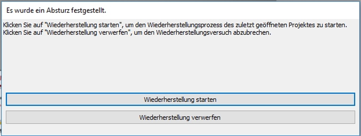 Wählen Sie "Wiederherstellung starten", um den Wiederherstellungsprozess des zuletzt geöffneten Projektes zu starten. Wählen Sie "Wiederherstellung verwerfen", um den Wiederherstellungsprozess abzubrechen.