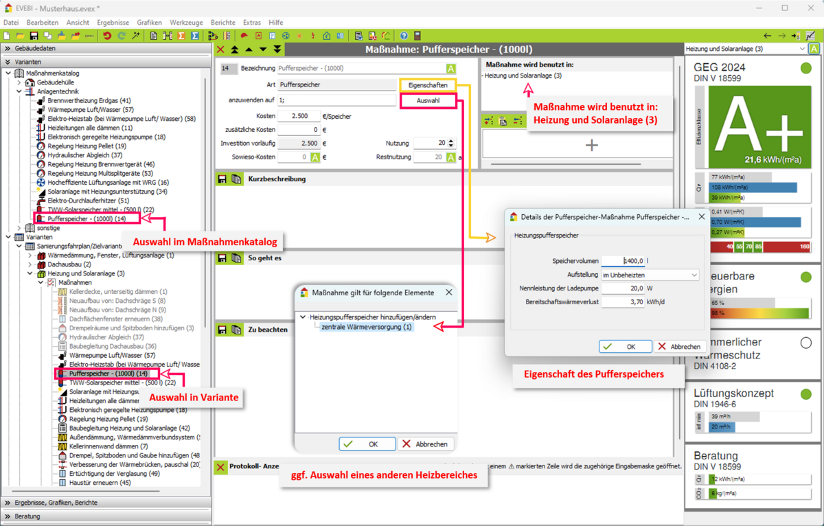 - Prüfen Sie die Kosten und die Nutzungsdauer der Maßnahme. Kosten: Die Kosten beziehen sich auf einen Heizungspufferspeicher. Sind mehrere Heizbereiche ausgewählt worden oder handelt es sich um Multibereiche, so werden die Kosten mit der Anzahl der Bereiche multipliziert. zus. Kosten: Tragen Sie hier ggf. Kosten ein, die zusätzlich zu den Kosten anfallen. Nutzung: Geben Sie die Nutzungsdauer der Maßnahme an. Diese wird bei der Wirtschaftlichkeitsberechnung berücksichtigt. Haben Sie in einer Variante Maßnahmen mit verschiedenen Nutzungsdauern erfasst, so werden für die Berechnung der Wirtschaftlichkeit die Nutzungsdauern nach der Investitionssumme gewichtet.