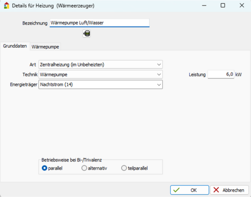 Ausführliche Erläuterungen zu den Heizungsdaten finden Sie unter: Wärmeerzeuger (DIN V 4701-10/12, LEG bzw. Wärmeerzeuger (DIN V 18599)
