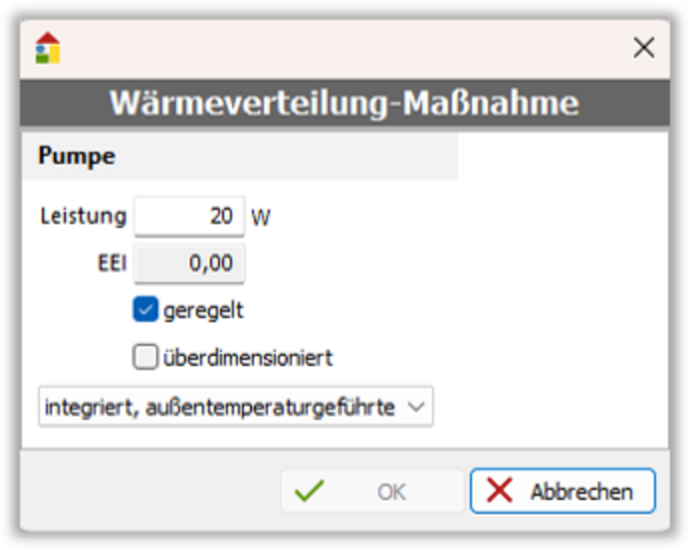 Pumpe ist überdimensioniert: nur für Berechnung nach DIN V 18599 relevant! Mit dieser Option wird der Überdimensionierungsfaktor auf 2 gesetzt (Berechnung der Aufwandszahl der Pumpe).
