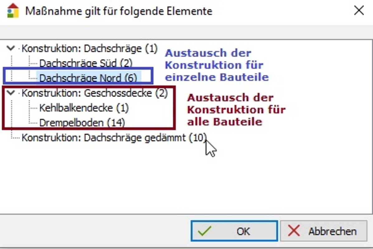 Die Maßnahme KONSTRUKTIONSTAUSCH ermöglicht, in einem Schritt mehreren Bauteilen eine neue Konstruktion zuzuweisen.