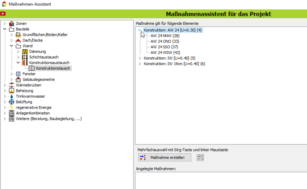 - Wählen Sie die Konstruktion, die ausgetauscht werden soll. Im Maßnahmenassistenten kann gewählt werden: --> alle zu einer Konstruktion gehörenden Bauteile ändern --> Klick auf Hautpteintrag der zugeordneten Konstruktion oder --> einzelne Bauteile ändern --> Klick auf einzelne Bauteile; Mehrfachselektion mit Str-Taste