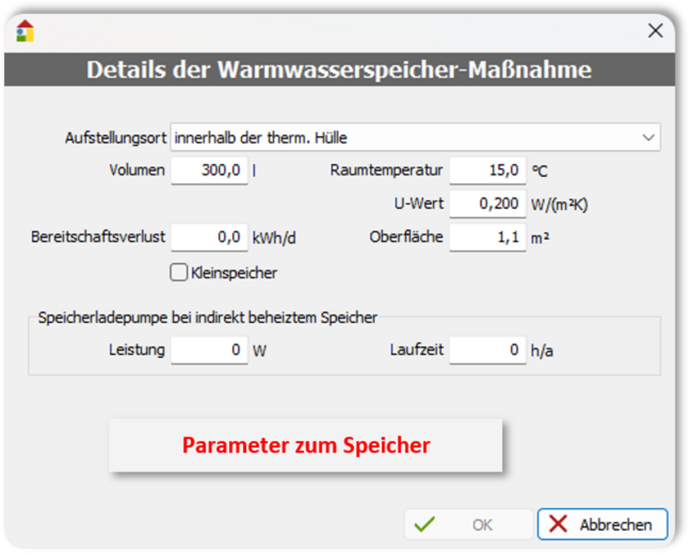 Kleinspeicher: Diese Option können Sie wählen, wenn mehrere kleine Speicher vorhanden sind. Geben Sie dann auch die Anzahl der Speicher ein.Raumlufttemperatur:Wird ein Vorschlag eingetragen, so wird von einer Aufstellung des Speichers im Keller ausgegangen und die in den Vorgaben genannte Temperatur gesetzt.