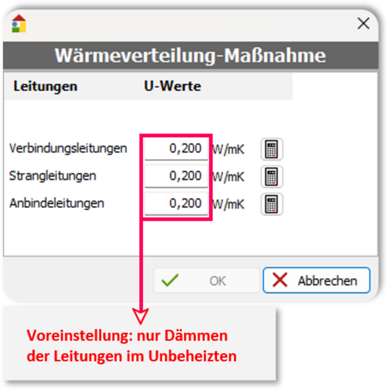 Werden Felder mit 0 belegt, so wird der Dämmstandard aus dem Ist-Zustand übernommen, d.h. keine Verbesserung dieser Leitungen.