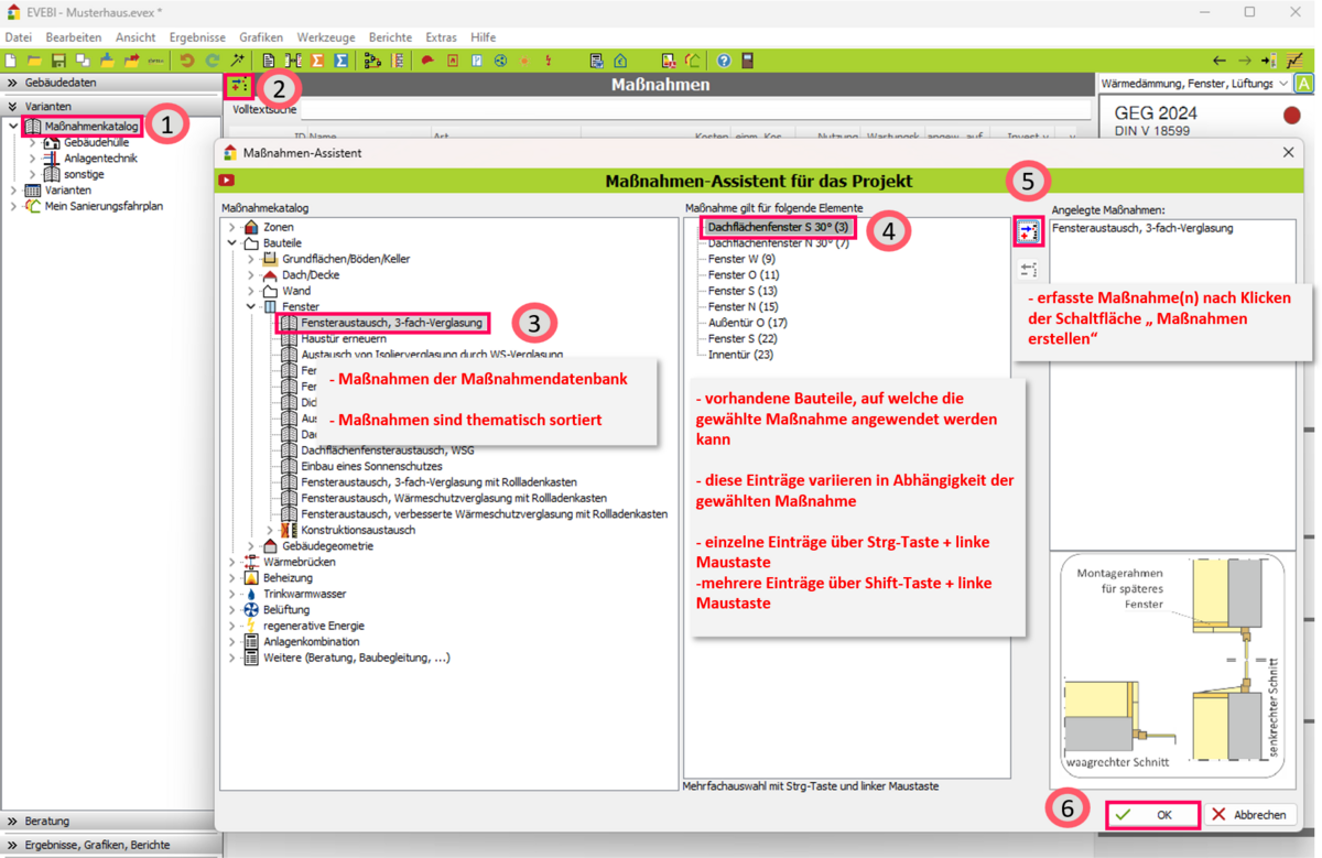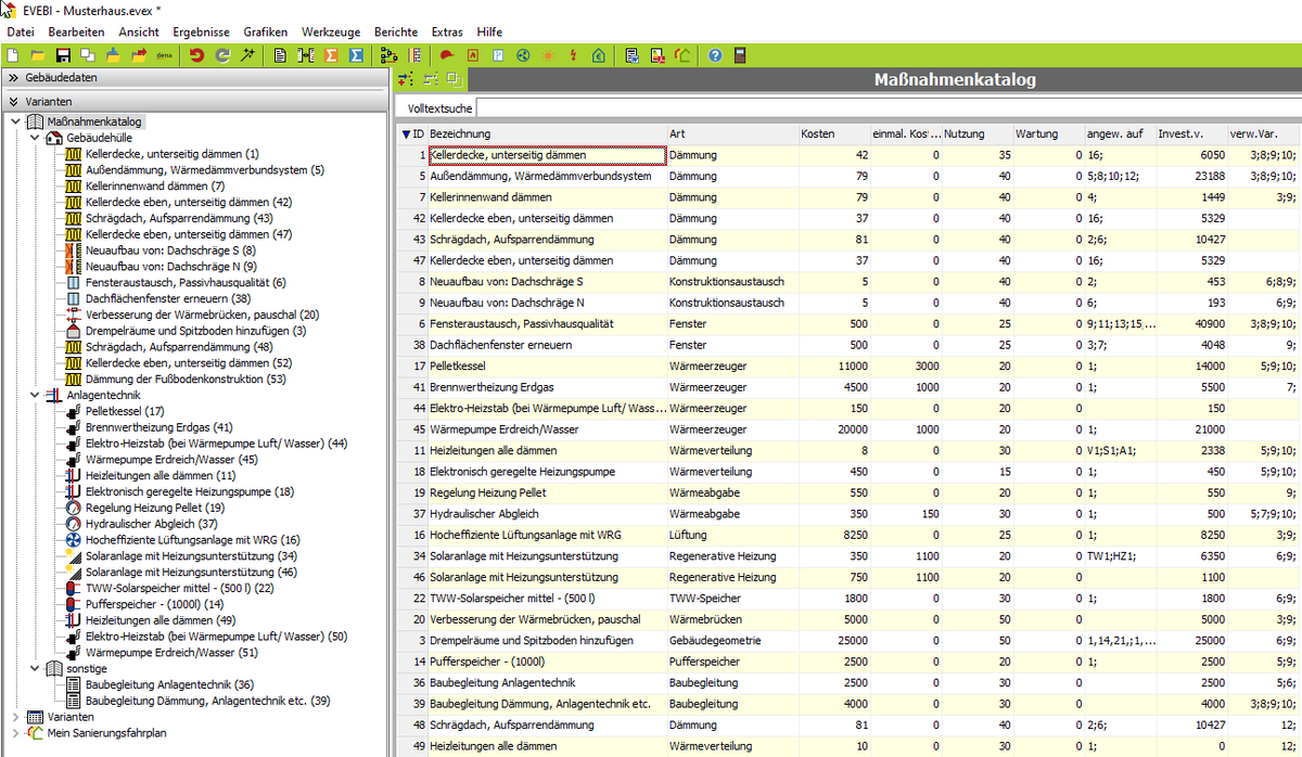 4. Maßnahme wählen: Wählen Sie im Maßnahmen-Explorer einen Bereich und eine gewünschte Maßnahme und klicken Sie diese Maßnahme an. Im mittleren Bereich werden alle zur gewählten Maßnahme möglichen Bauteile, Heizbereiche etc. angezeigt.