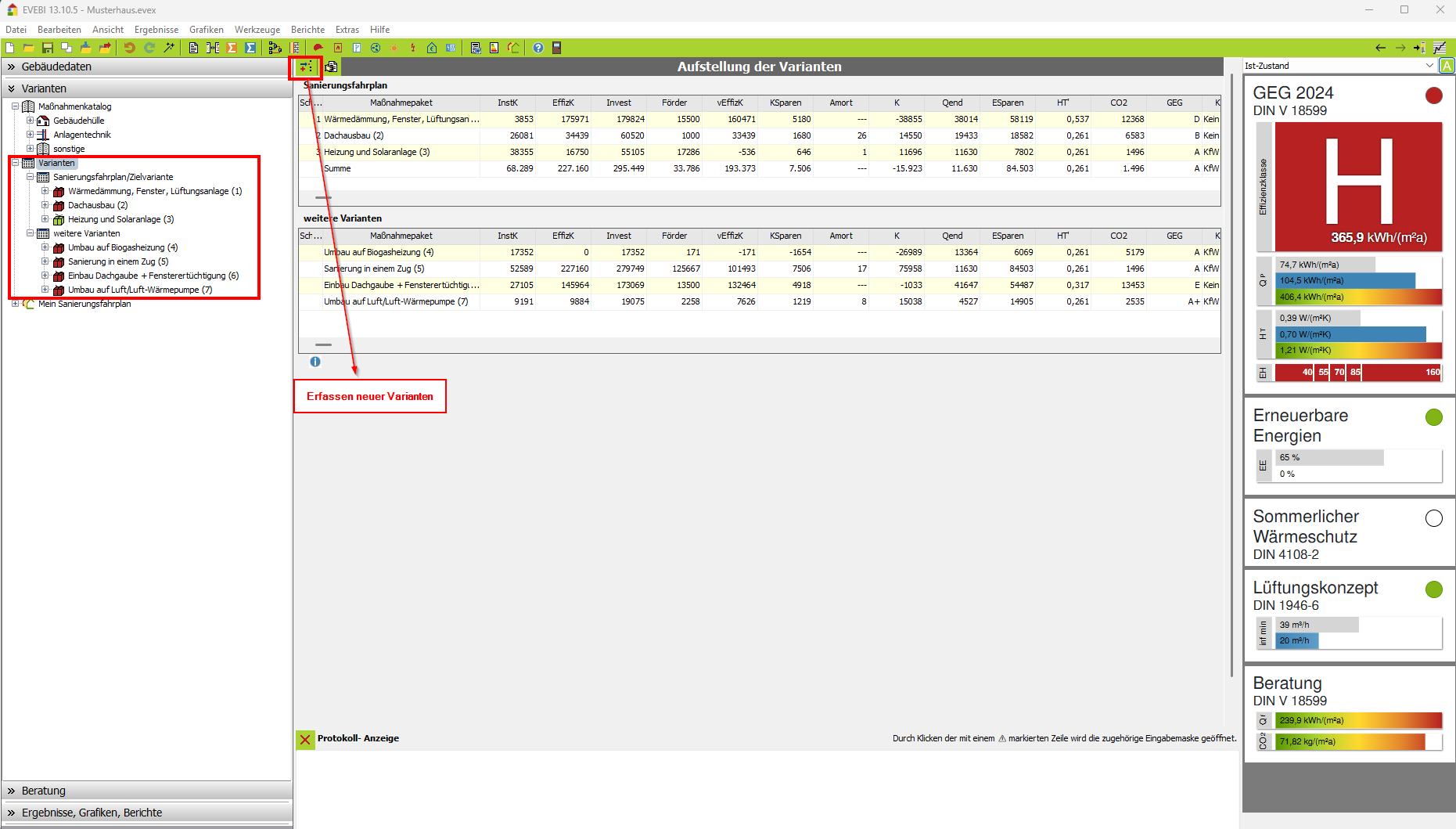 Sie können für das aktuelle Objekt mehrere Varianten (Maßnahmenpakete) mit einer oder mehreren Maßnahmen erfassen. Für jede Variante wird ein eigenes Verzeichnis im Navigationsbereich angelegt. Sie haben die Möglichkeit, die Varianten bzgl. ihrer Energieeinsparung, Kosten, Amortisation etc. zu vergleichen.