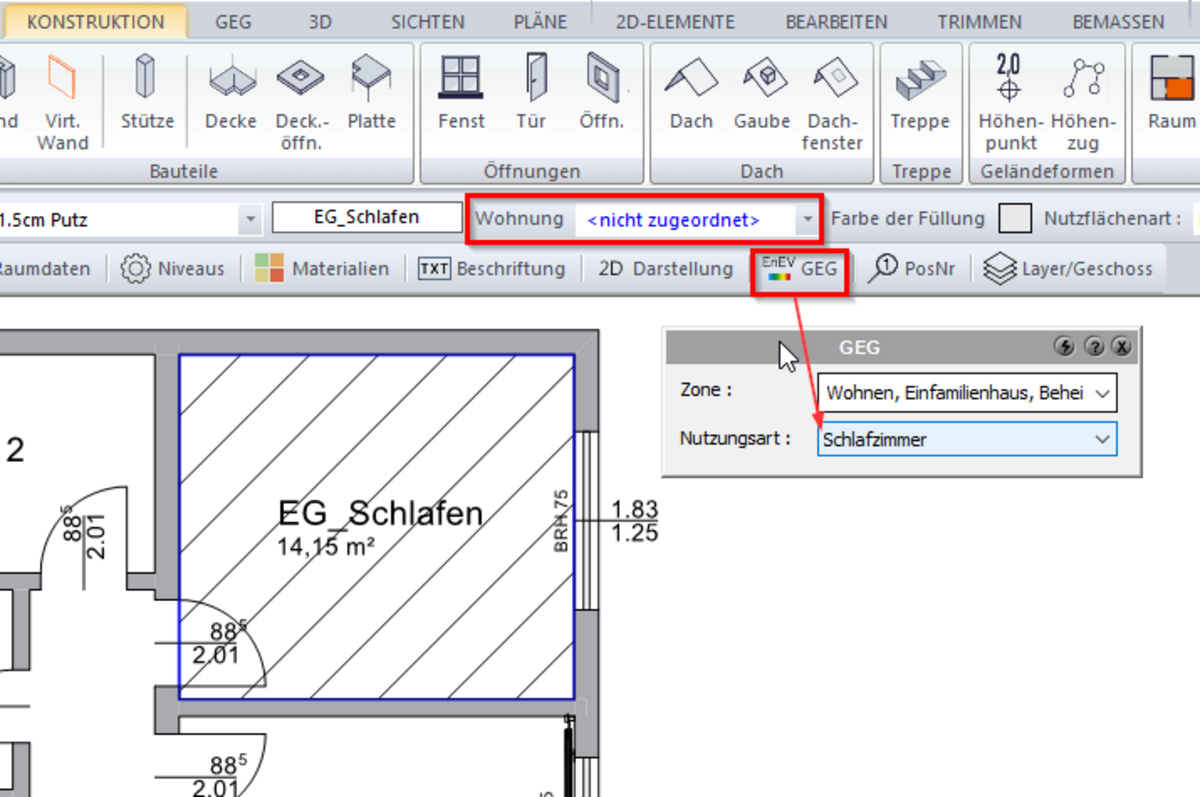 Konstruktions-Modus öffnen und den Raum anwählen. In der Raum-Bearbeitungsleiste gibt es den Eintrag WOHNUNG. Dort erfolgt die Zuordnung der Nutzungseinheit (EVEBI --> Rambuch --> Raum --> Feld NUTZUNGSEINHEIT).