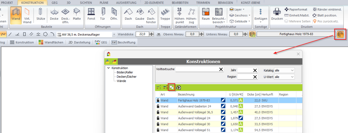 Eine nachträgliche Zuweisung der Konstruktion ist ebenfalls möglich. Diese muss dann über den GEG-Modus erfolgen. Beachten Sie dabei, dass die Dicke der Konstruktion in das Bauteil übernommen wird. Das gilt für Wände, Decken/Dächer, Fenster/Türen.