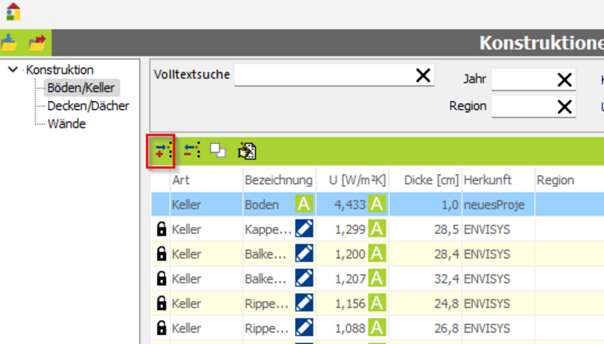 Wollen Sie Konstruktionen in ihrem Baustoffen oder Dicken anpassen, ist das in der EVEBI-Datenbank möglich. Dafür müssen Konstruktionen, die mit einem Schloss versehen sind, erst kopiert werden. In der kopierten Konstruktion können dann die gewünschten Änderungen durchgeführt werden. Der modifizierte Konstruktionsdatensatz kann dann einem Bauteil zugewiesen werden.