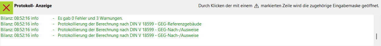 Warnung: Eine Warnung gibt das Programm aus, wenn unproblematische Variablen fehlen, Plausibilitäten nicht eingehalten werden etc. Anhand der Warnung können Sie nachvollziehen, was ggf. noch vervollständigt bzw. verbessert werden kann.