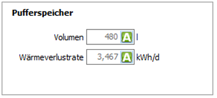 Pufferspeicher Volumen: Ist ein Pufferspeicher vorhanden (dies sollte der Fall sein, wenn das KWK Modul mehr als 20% des Wärmebedarfs decken soll), so wird hier die Speichergröße in Litern angegeben. Der Pufferspeicher puffert die Wärme, um Taktung zu vermeiden und um die Laufzeit des Moduls gegenüber dem Spitzenlastkessel zu verlängern. Die Größe hängt von der Nutzung (z.B. Trinkwarmwassernutzung, Wohneinheiten) und von der Modulgröße ab. Im Standardfall wird ein sinnvoller Wert vorgeschlagen.