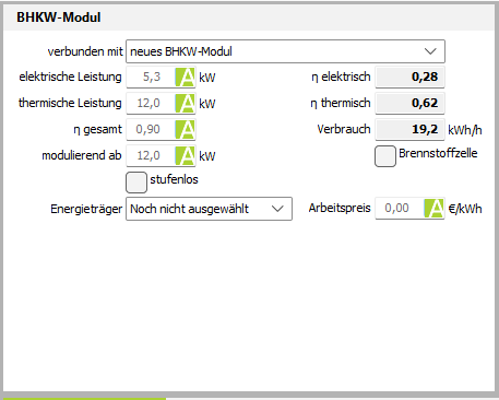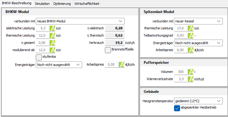 Im anderen Fall (keine Verbindung) handelt es sich um ein neues BHKW-Modul und einen neuen Kessel. Auf Wunsch kann ein KWK-Modul aus der Datenbank entnommen werden. Die Daten sollten dann vollständig bereitstehen. Für den Spitzenlastkessel sind lediglich die thermische Leistung und der Teillastwirkungsgrad zu erfassen. Die gesamte thermische Leistung (Summe aus BHKW und Kessel) sollte mindestens der Heizlast entsprechen.