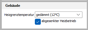 Im Abschnitt Gebäude ist der Stand der Dämmung anzugeben. Es wird unterschieben in sehr gut gedämmt (10°C), gedämmt (°C) oder ungedämmt (15°C). Es wird außerdem angegeben ob es einen abgesenkten Heizbetrieb gibt.