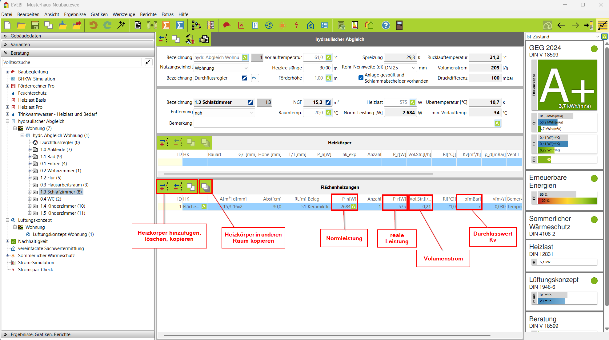Passen Sie die Heizkörperdaten soweit an, dass eine möglichst geringe Übertemperatur und gleichmäßige Spreizung in allen Räumen erreicht wird.