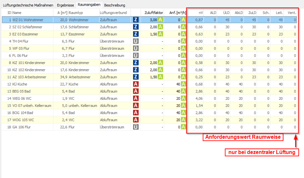 Diese Ergebnisse beziehen sich auf die gesamte Nutzungseinheit (Wohnung) und weichen daher in der Regel von den Ergebnissen in der oberen Maske ab, welche sich auf die einzelnen Räume beziehen (Summe der Volumenströme der Räume). Hinweise * Bemessung nach Nennlüftung (NL) Pflicht ! * Bemessung nach Intensivlüftung (IL) empfohlenRaumangaben zur ventilatorgestützen Lüftung 8. Wechseln Sie auf das Register Raumangaben: (siehe Bild)
