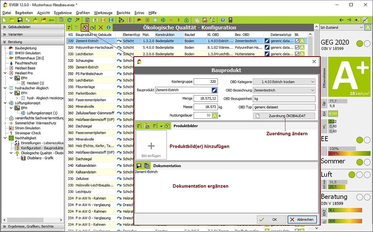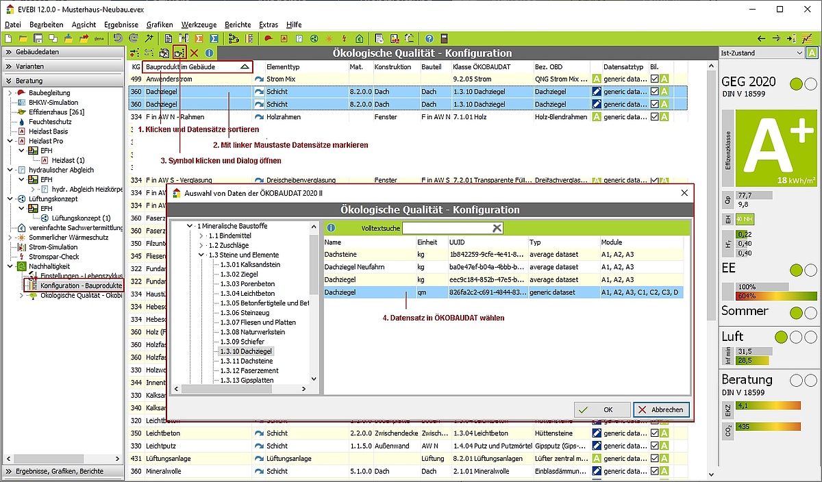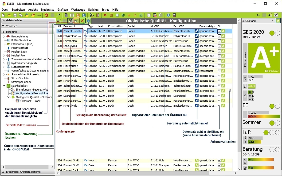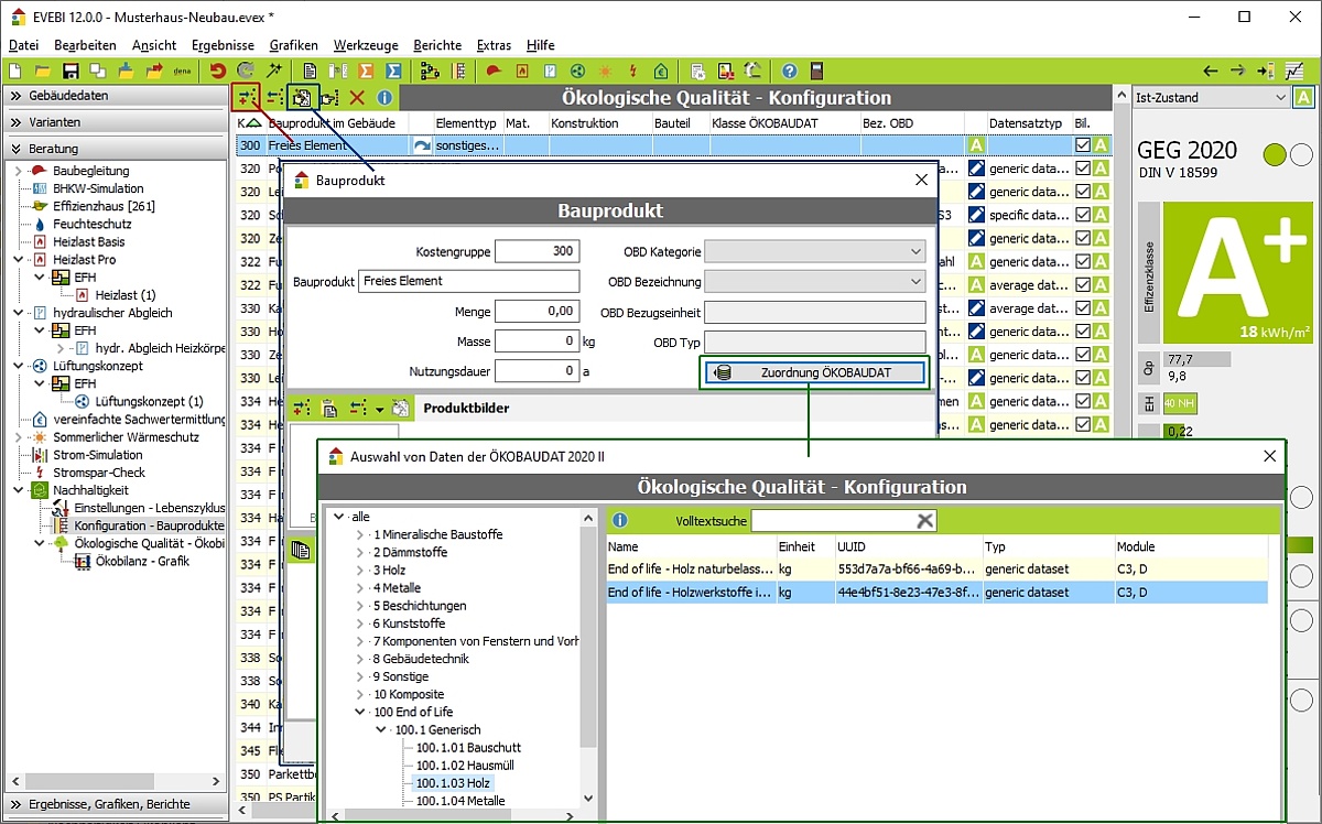 Die Zuordnung der Datensätze der ÖKOBAUDAT erfolgt fast komplett automatisch anhand der vorgefundenen Baumaterialien und Anlagentechnik.