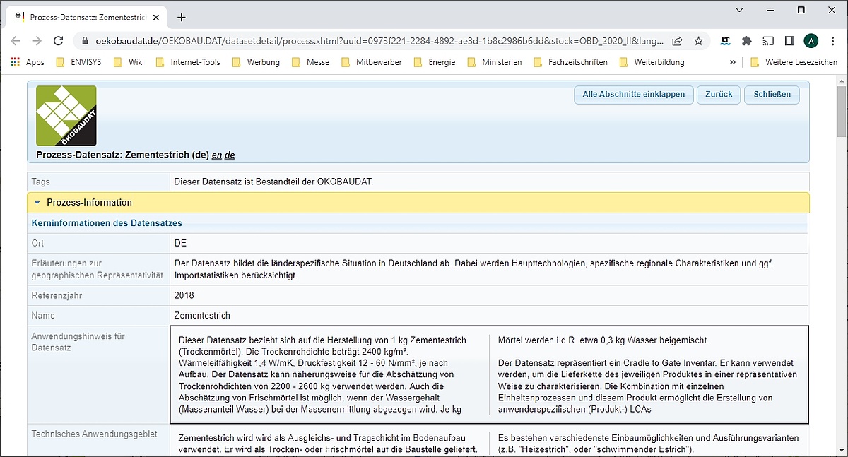 Details der ÖKOBAUDAT bzw. der Tabelle Ökobilanzierung Rechenwerte 2023 im Browser anzeigen