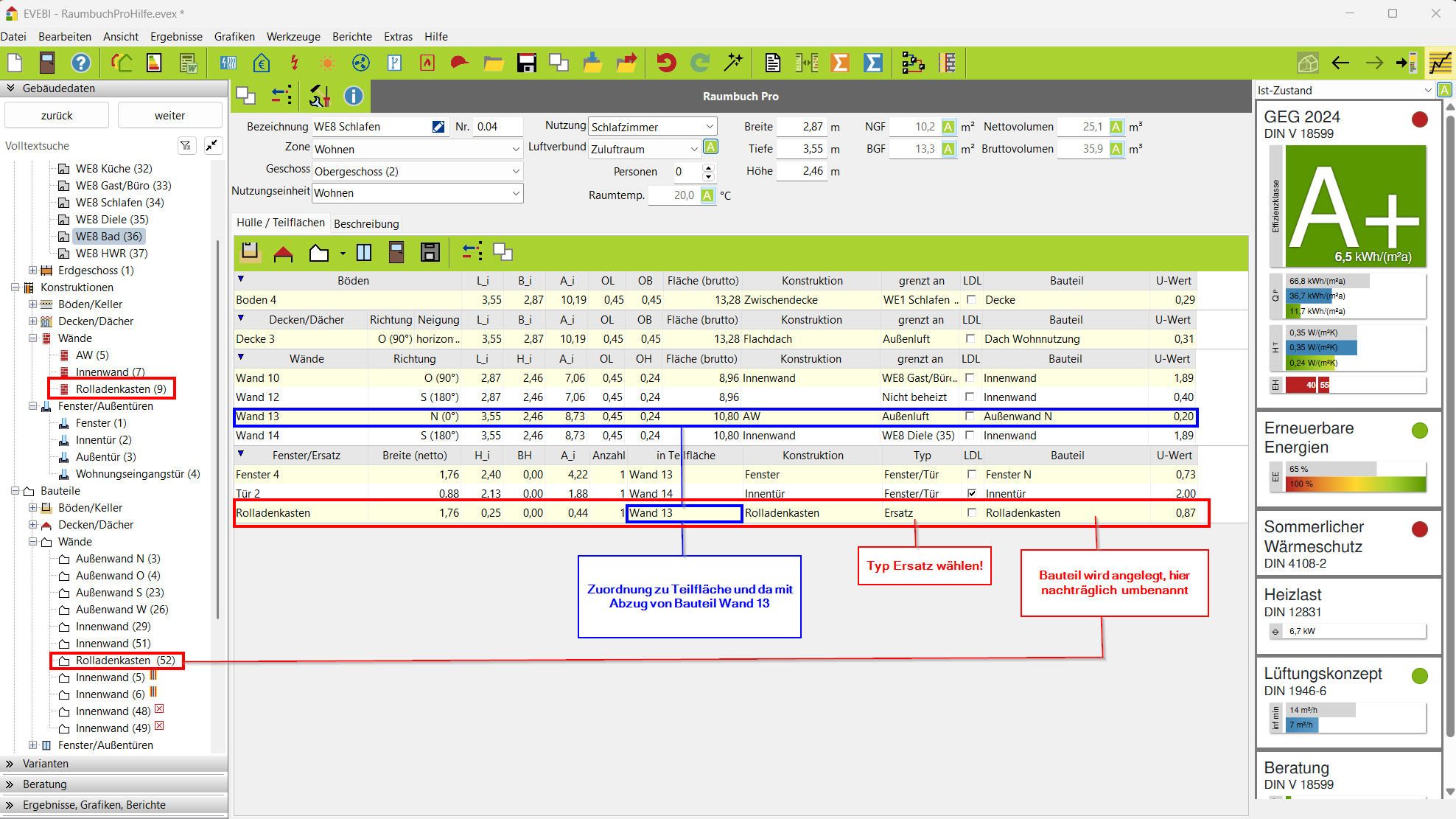 - Fenster/Ersatz: Die Bezeichnung der Fläche kann geändert/erweitert werden (im obigen Beispiel Rollladenkasten).