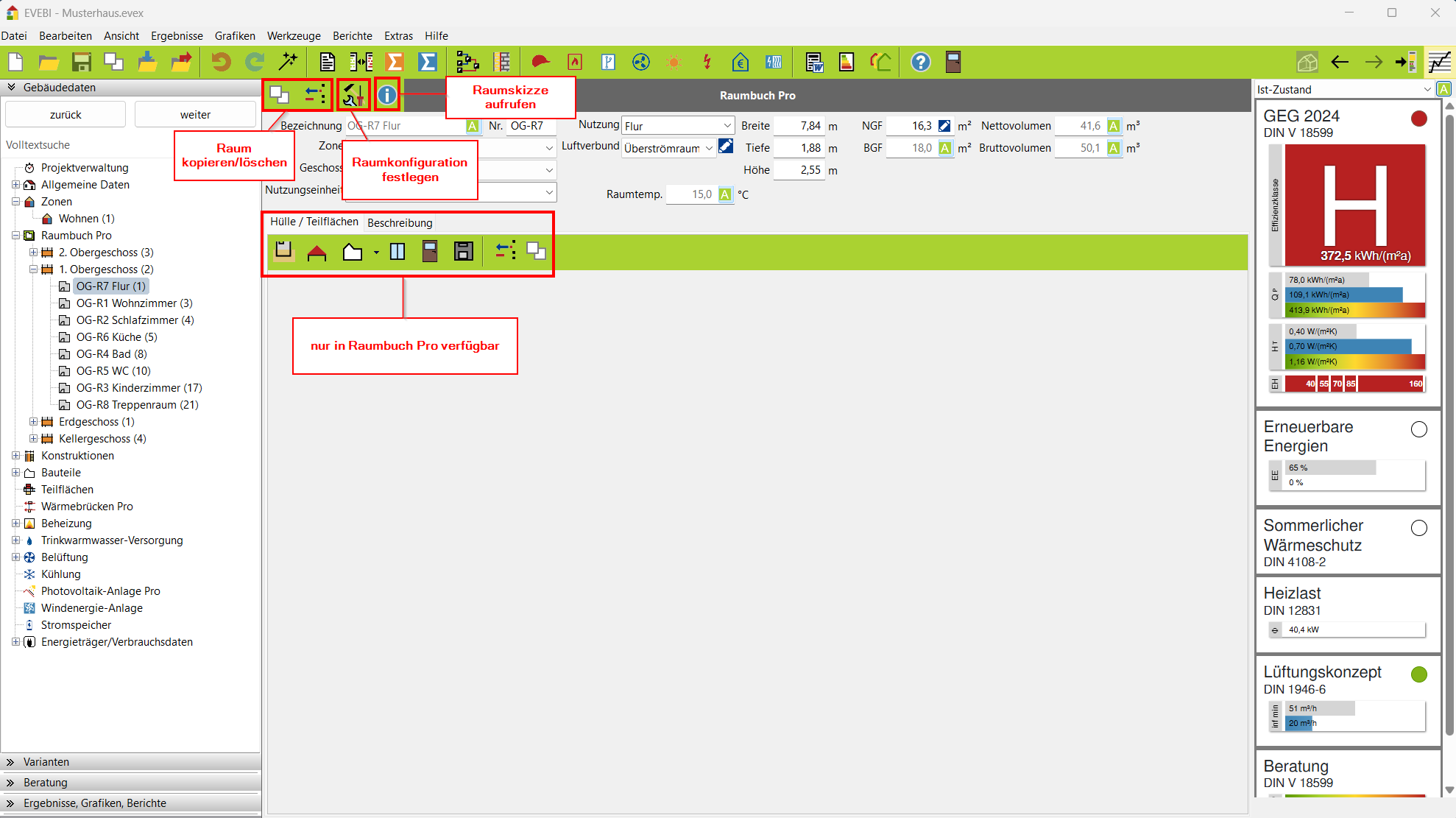 - Das Erfassen der Räume sollte vor dem Erfassen von Bauteilen erfolgen! (nur Raumbuch Pro)