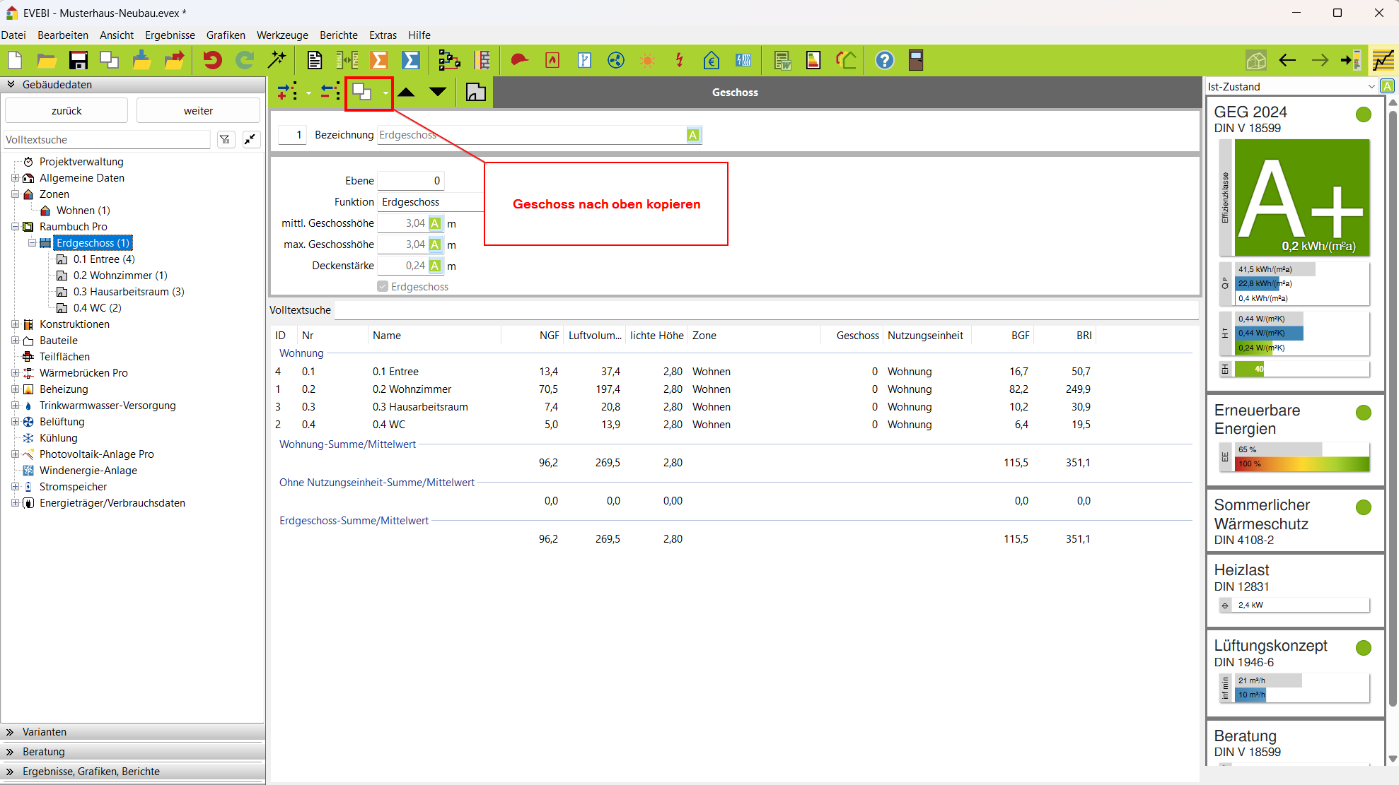 Sie haben die Möglichkeit, ein komplettes Geschoss zu kopieren. Das ist in Mehrfamilienhäusern sinnvoll, bei denen mehrere Etagen identisch sind.