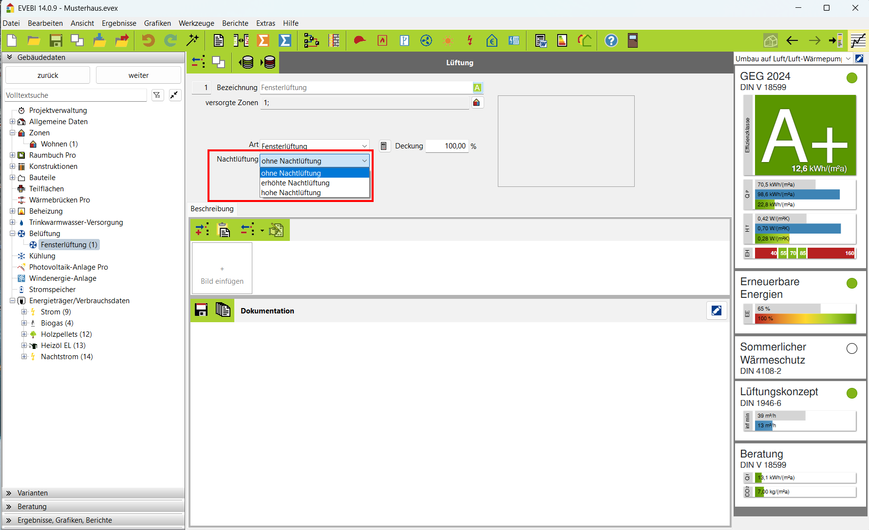 Bei der Angabe der Lüftung ist insbesondere die Angabe zur Nachtlüftung (ohne, erhöhte, hohe) für die Ermittlung des anteiligen Sonneneintragskennwertes (4108-2:2013, Tabelle 8) relevant.